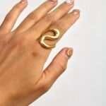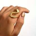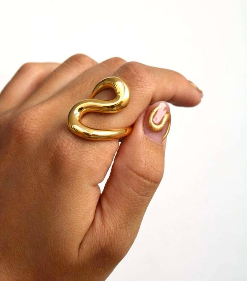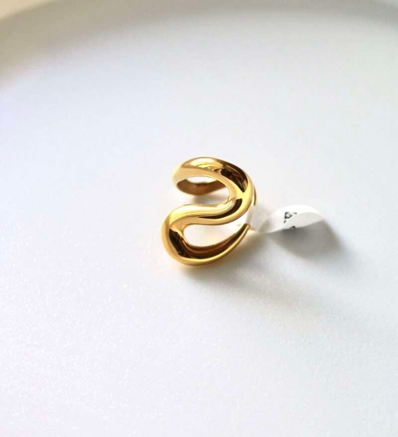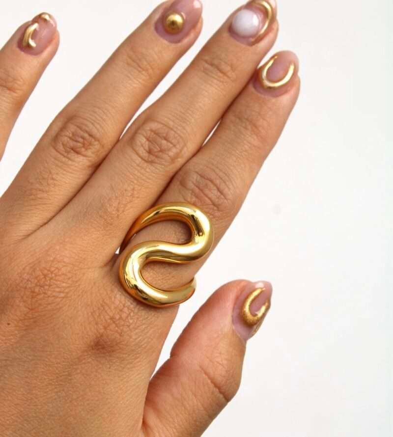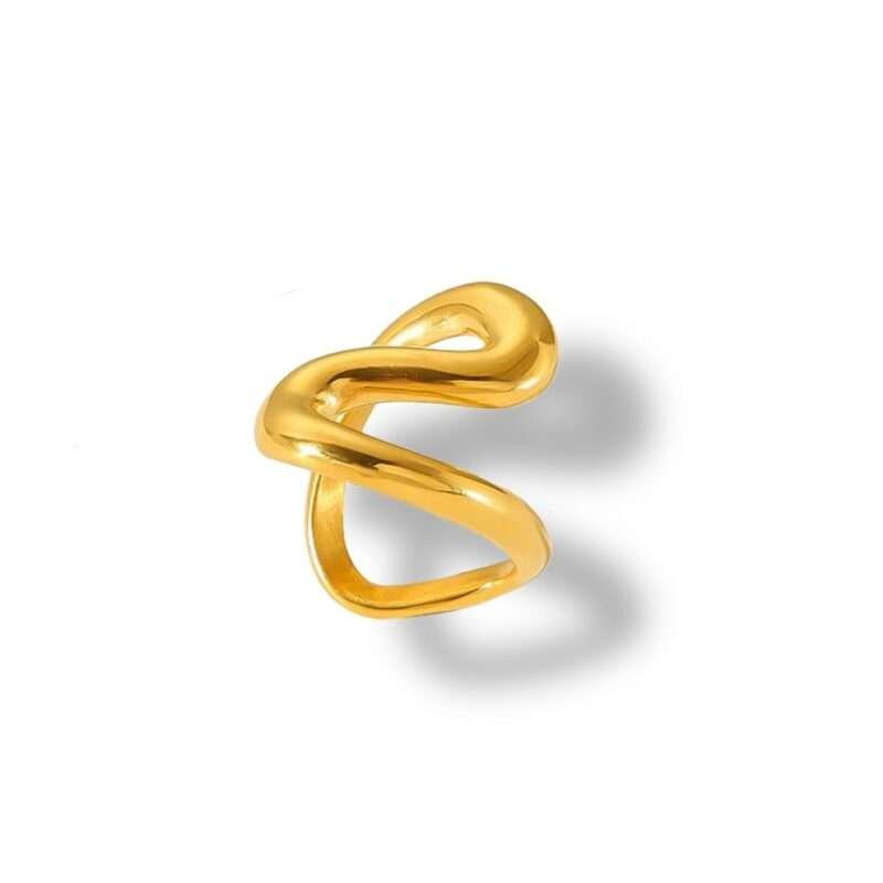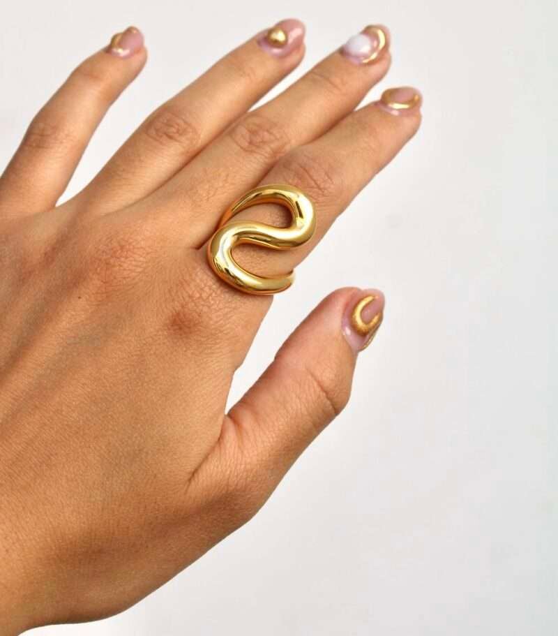 Este anillo, con su diseño de curvas suaves y fluidas, es una verdadera obra de arte. El acero inoxidable chapado en oro de 18k le aporta un brillo eterno. Un diseño que captura la esencia del movimiento y la elegancia.