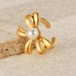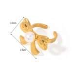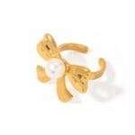 Anillo abierto con forma de moño con perla de acero inoxidable chapado en oro de 18k.