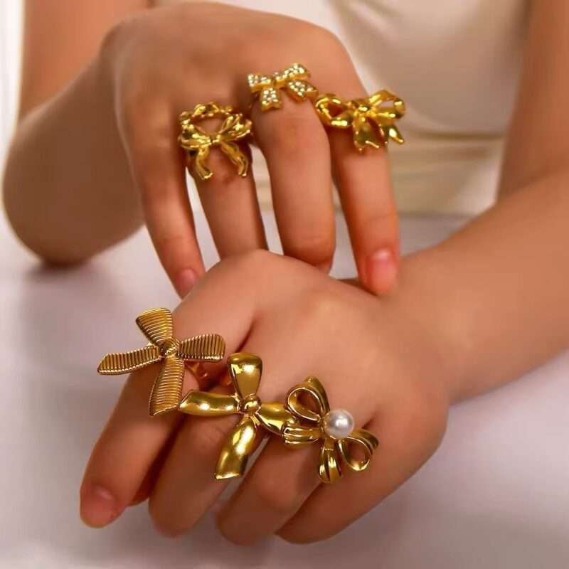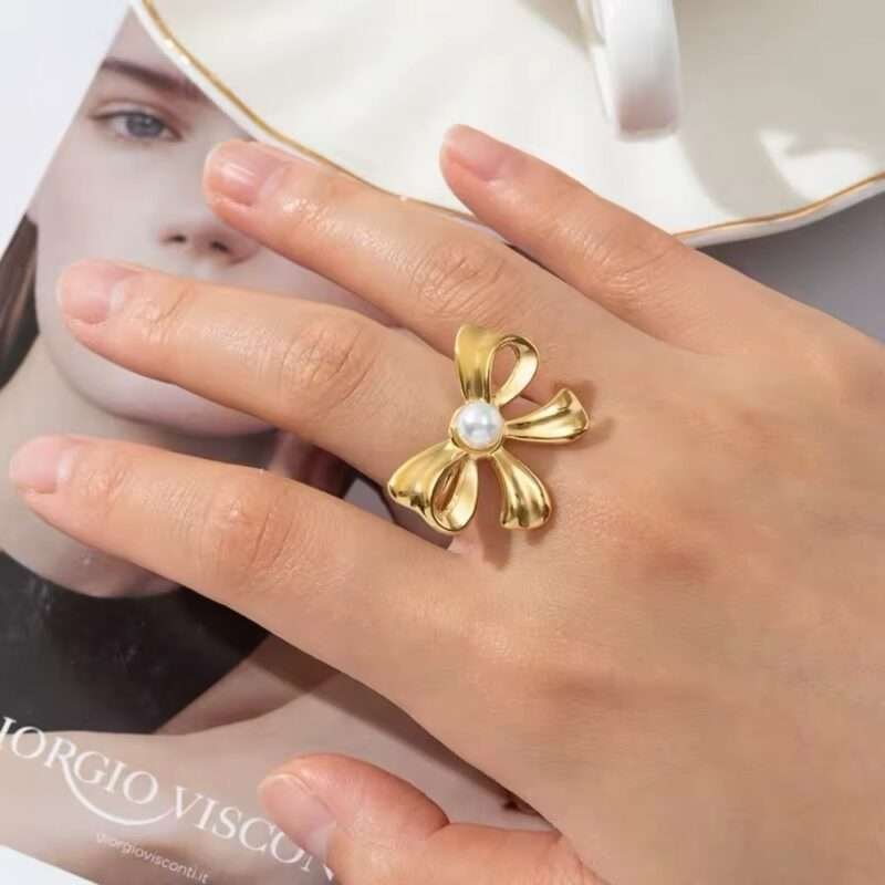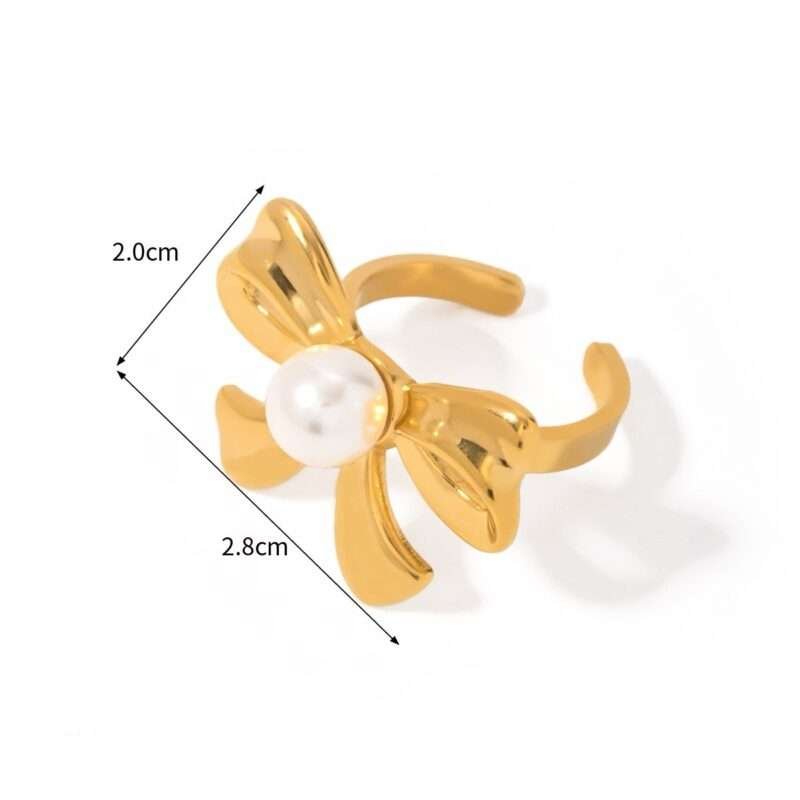 Este anillo abierto con forma de moño es puro encanto. Su diseño delicado, con una perla que brilla como un lujoso detalle, te hará sentir sofisticada y femenina.