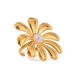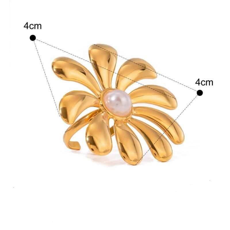 Anillo abierto con forma de Margarita con boton de perla en acero inoxidable chapado en oro de 18k.