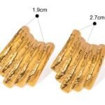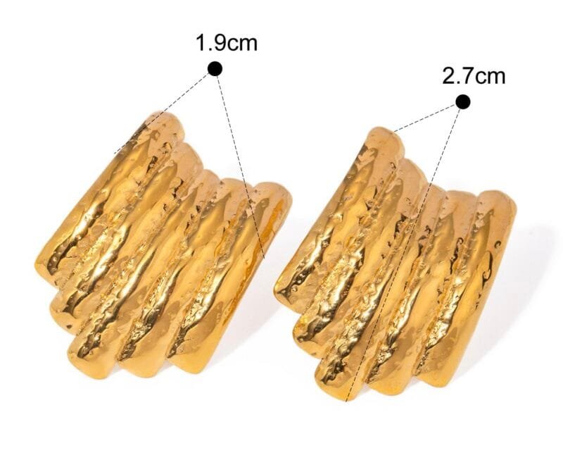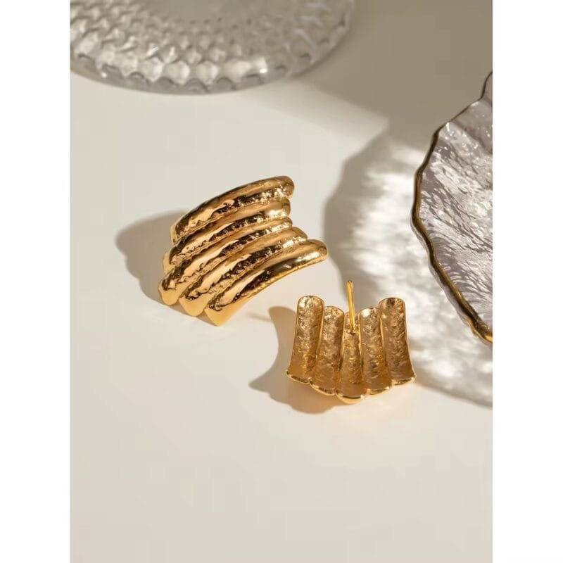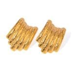 Aretes luciana es un diseño con multiples capas superpuestas de forma curva y asimetrica de acero inoxidable chapado en oro de 18k.