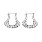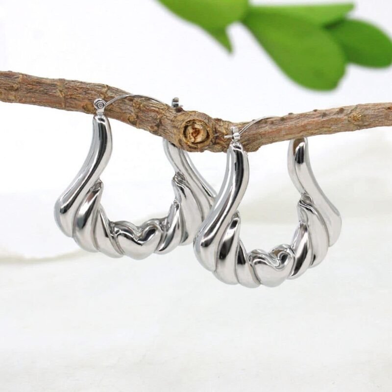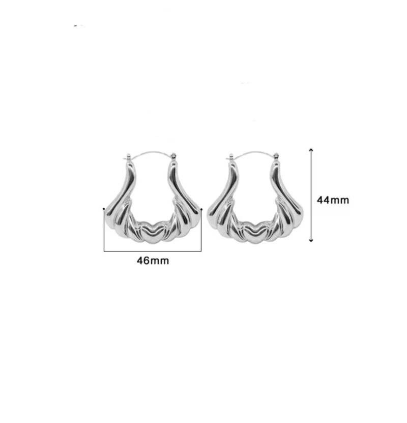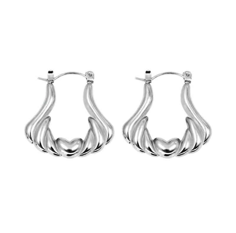 Elegante par de aretes elaborado en acero inoxidable con chapado plateado con un diseño único y vanguardista, una pieza visualmente impactante y llena de movimiento. Cada aro presenta una serie de ondulaciones que culminan en un delicado corazón en el centro, añadiendo un toque romántico y femenino.