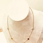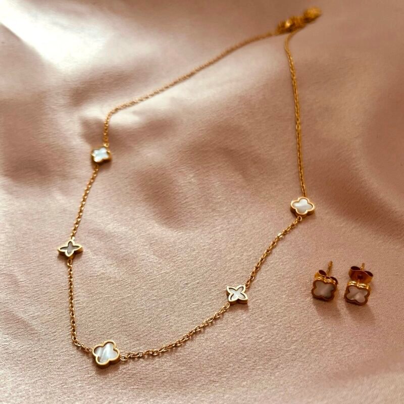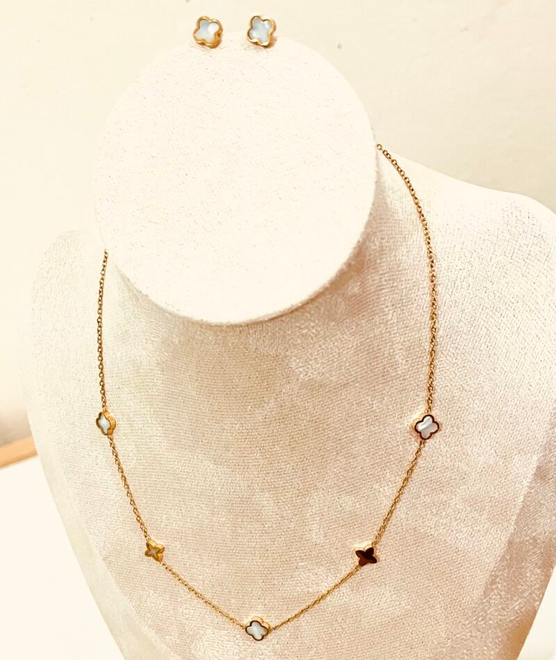 Juego de cadena y aretes en forma de trébol de acero inoxidable chapado en oro de 18k.